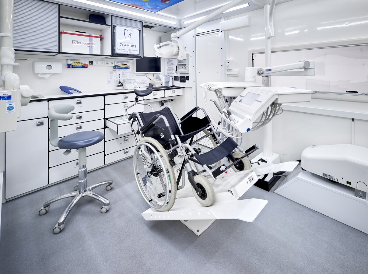 Eine Besonderheit betrifft vor allem die Ausstattung der mobilen Zahnarztpraxis: Neben der kompletten Ausstattung für die Versorgung der Patienten und einem Behandlungssessel mit einem Gewicht von mehr als 150 Kilogramm ist das Fahrzeug mit einer Anbindung an den Zentralrechner in der Hauptpraxis ausgestattet. Hinzu kommen eine Strom- und Frischwasserversorgung und vor allem eine Neigevorrichtung, um Patienten direkt im Rollstuhl behandeln zu können. Das Tiefrahmen-Chassis wiederum erlaubt älteren Patienten einen niedrigen Einstiegswinkel über eine automatische Schiebetür und erleichtert den Zugang zum Kleintransporter der Brüder Clamors.
