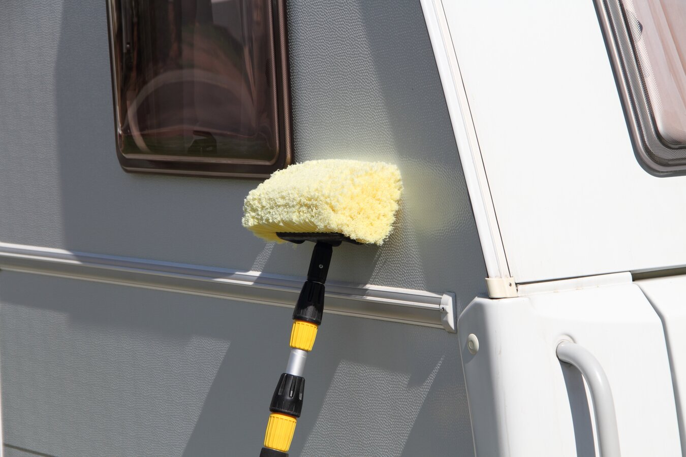 You can either wash the exterior at an official washing area (for self-washing) for motorhomes, caravans, vans or even trucks, or there are also special washing facilities for these large vehicles. In the first step, hose down the exterior and carefully scrub it with a brush and detergent – it is best to wash the lower base afterwards to remove dirt from the chassis. Think about the wheel arches as well. Windows and roof hoods are usually made of acrylic and so should be omitted. You can get special cleaners and cloths to prevent scratching these. Then dry (or leave it to dry). Don’t forget the awning: Extend it out once, check for any damp spots and dirt deposits, and clean if necessary.